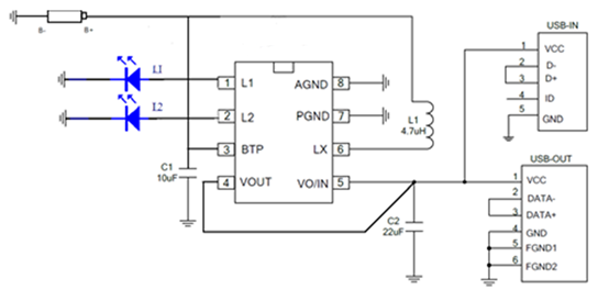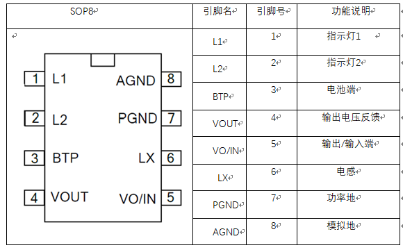 ◆ 输出电流0.8A(以电池3.6V为典型值),具有恒功率输出功能,过流保护,过压保护和短路保护。