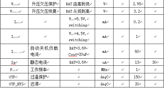 1、 待机状态监测负载大于10uA(典型值)电流时自动启动升压,当输出负载小于60mA(典型值)时,延迟8秒后自动进入待机模式。
